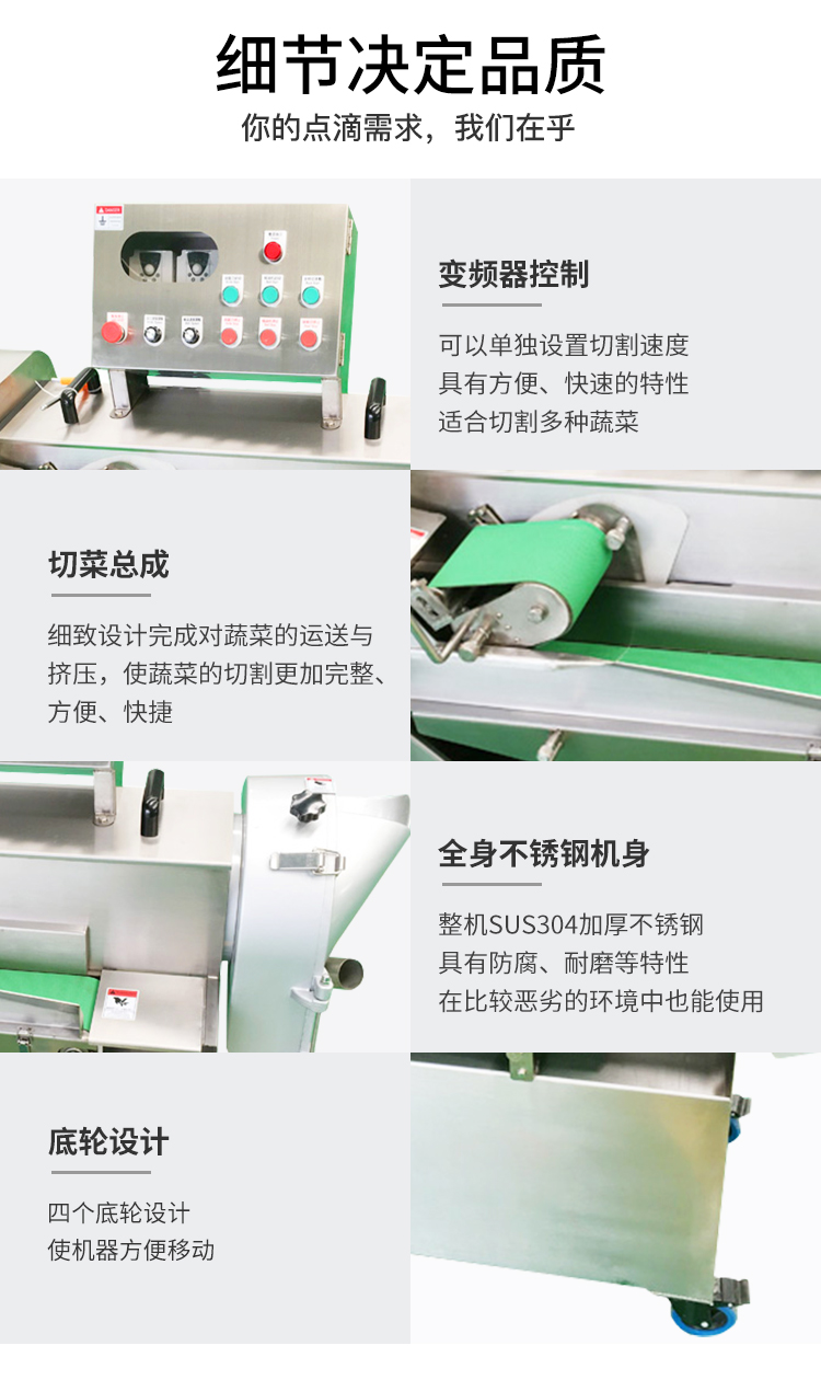 功能:可切片、切丝、切条、切段、切丁块,切馅 一机多用,功能强大,易操作,易清洗(快拆式输送带),切菜精度高,均匀。